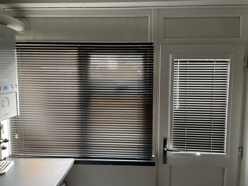 Made to measure Perfect Fit venetian blind fitted to Kitchen door and matching venetian blind fitted to side window.