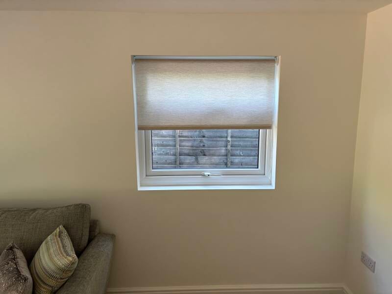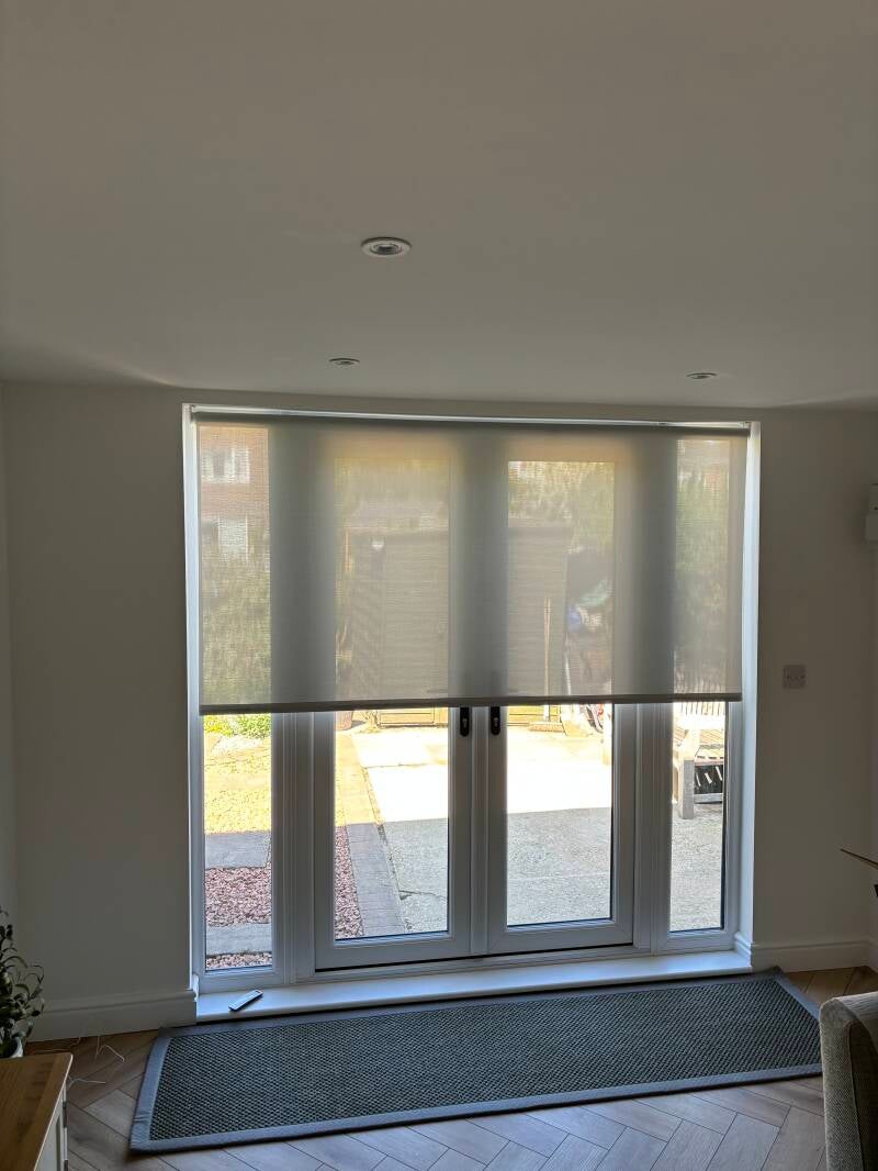 Made to measure roller blinds fitted to Kitchen, Living room and Bedroom. Motorised roller blind fitted to living room door area.