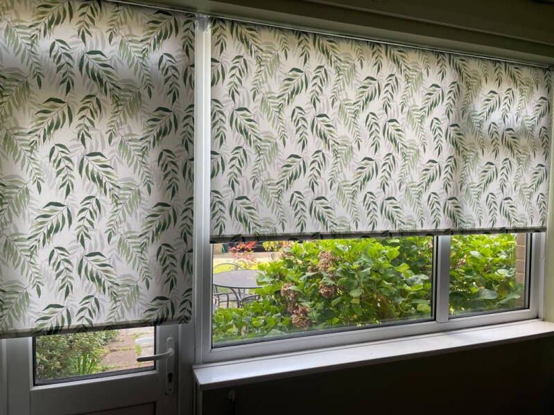Green leaf patterned roller blinds measured, supplied and fitted in Beckenham.