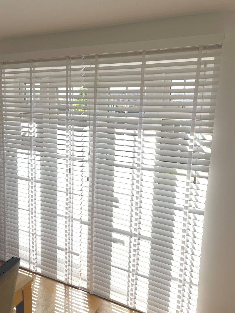 We have just installed white real wood venetian blinds to a large door area in Bromley, Kent. Normally we do not recommend venetians over the door area as they are heavy to pull up and would normally require ducking under the blind to access the garden. In this case we installed the blind on the outside of the recess to help with pulling blinds out the way of the door when open and by switching from faux wood venetians to real wood we have reduced the weight by at least a third.