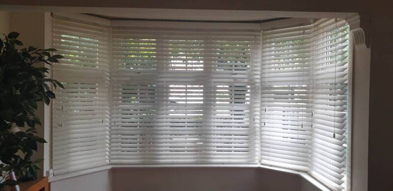 White wooden venetian blinds measured, made and fitted to a bay window in Bromley, Kent