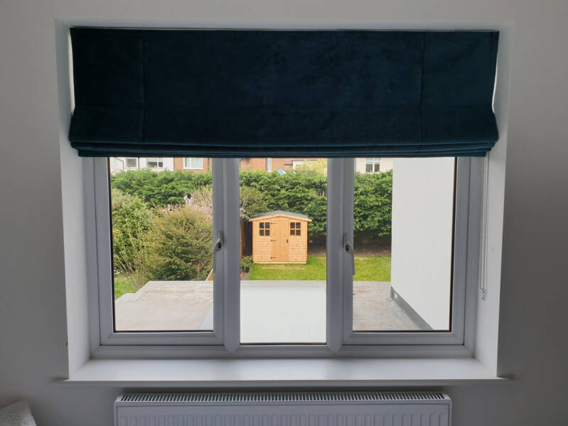 Blue roman blind with blackout lining measured, supplied and fitted in Sidcup.