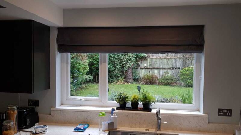 Made to measure grey roman blind fitted in Kitchen window in Hayes, Bromley.Request a FREE appointment today.