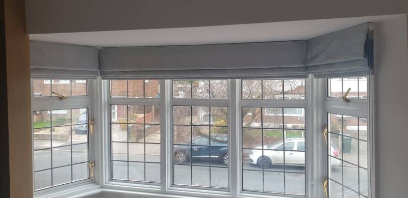 Roman blinds fitted to dog leg bay windows in Beckenham, Kent.