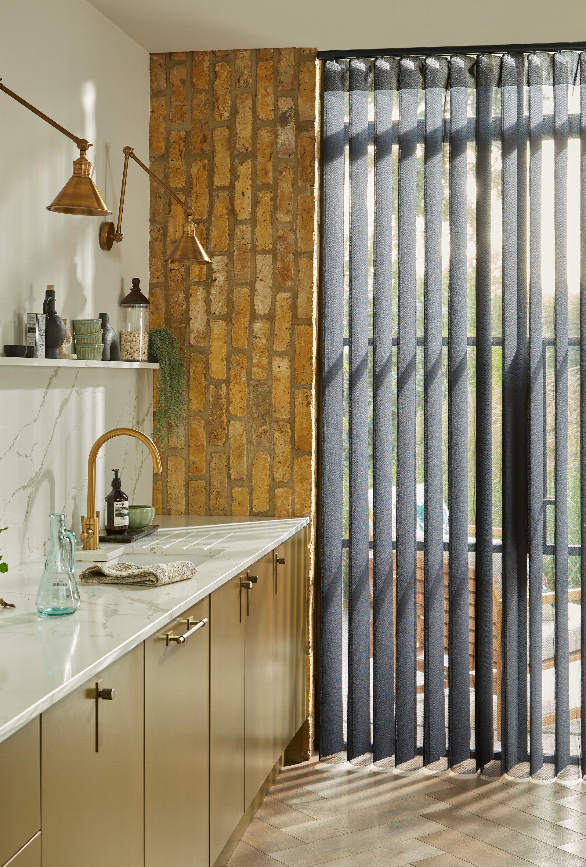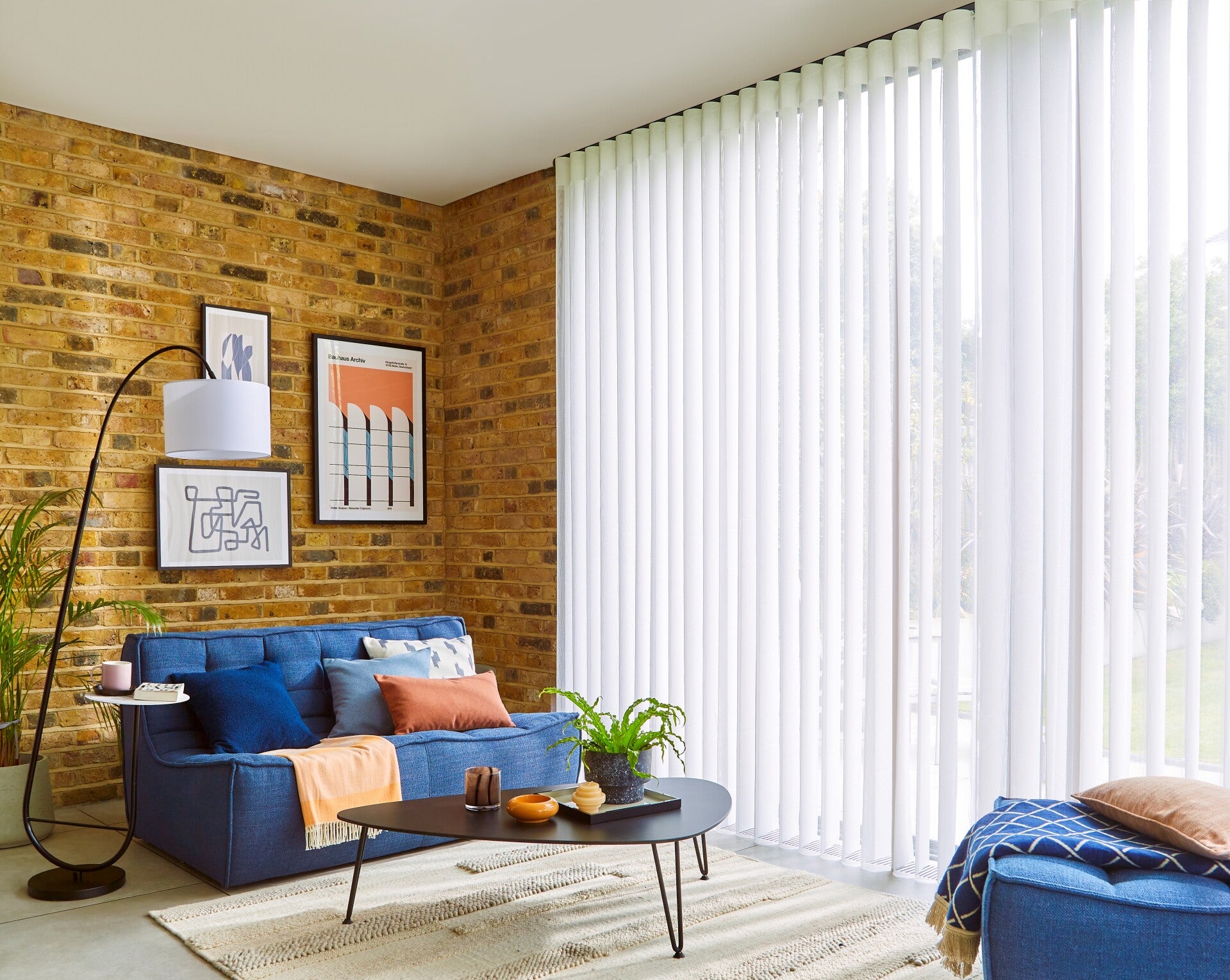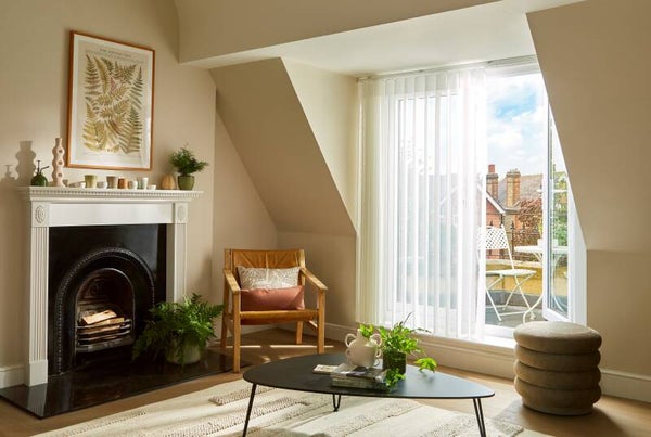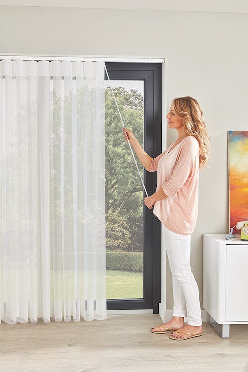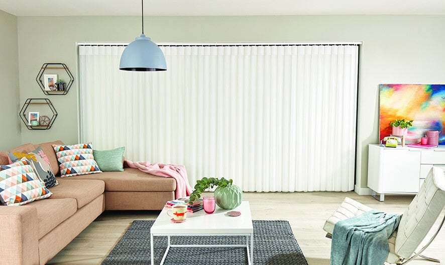 Made to measure Allusion blind fitted to a living room patio door. This blind offers everything a vertical blind does and more. Tilt the blind and you get privacy, Open up the blind fully by sliding to the side and you can walk through the blind when closed if you like.