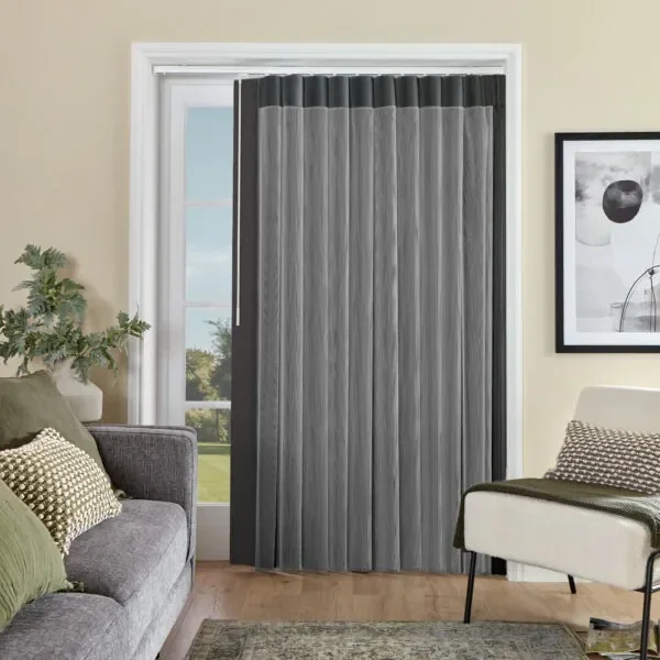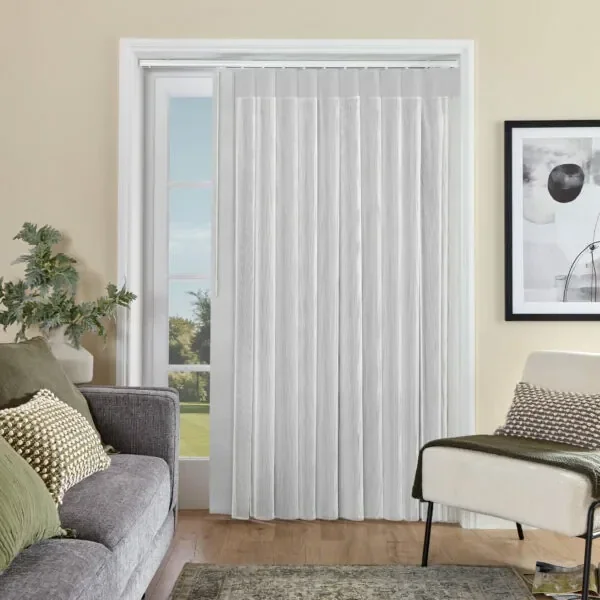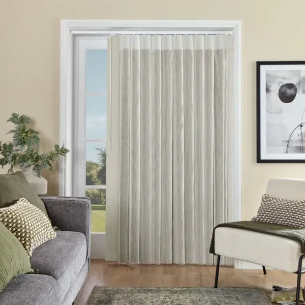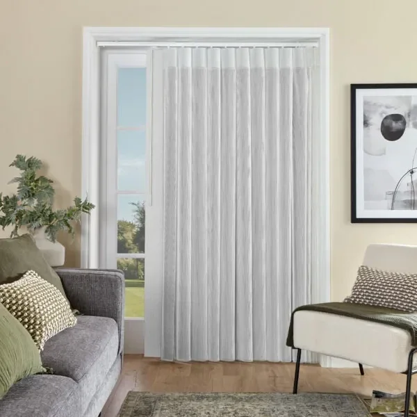 Made to measure Allusion blind fitted to a living room patio door. This blind offers everything a vertical blind does and more. Tilt the blind and you get privacy, Open up the blind fully by sliding to the side and you can walk through the blind when closed if you like.